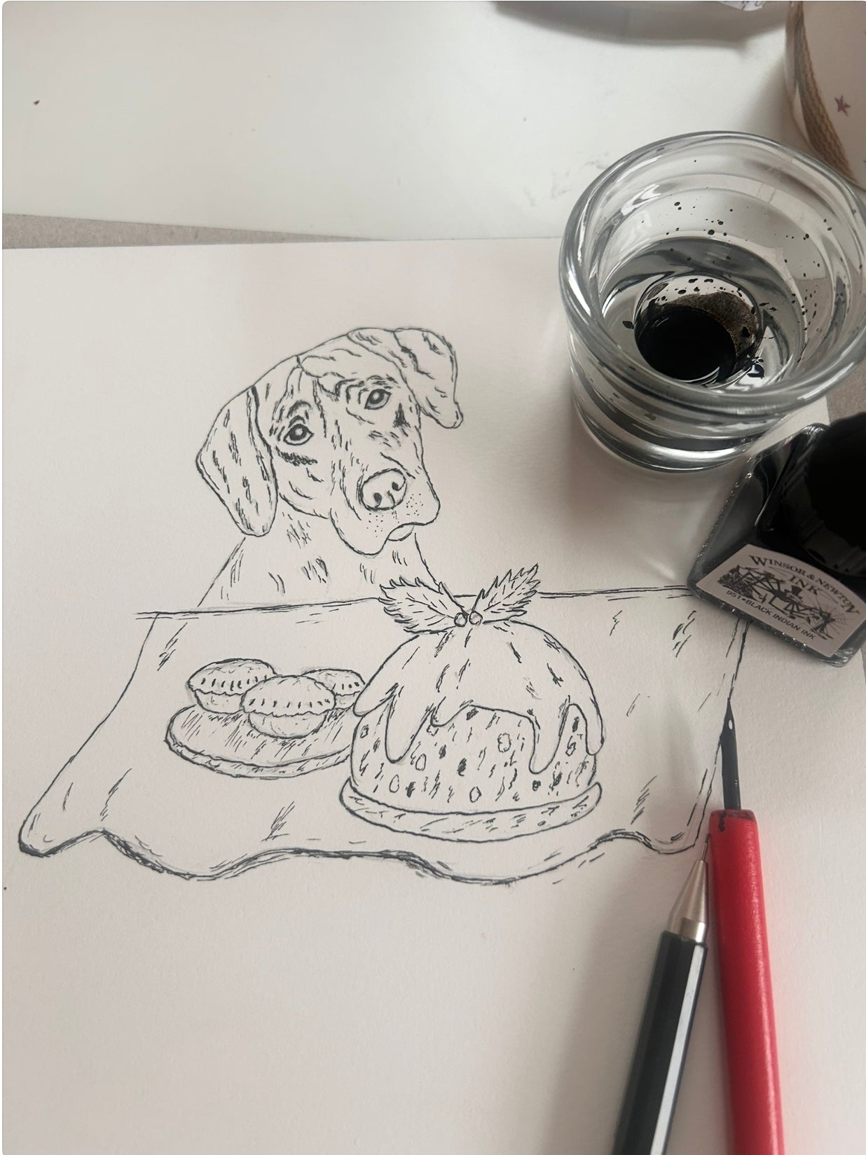 hand painted ink and watercolour illustration printed on a luxury greeting card, ideal for dog lovers at Christmas time.